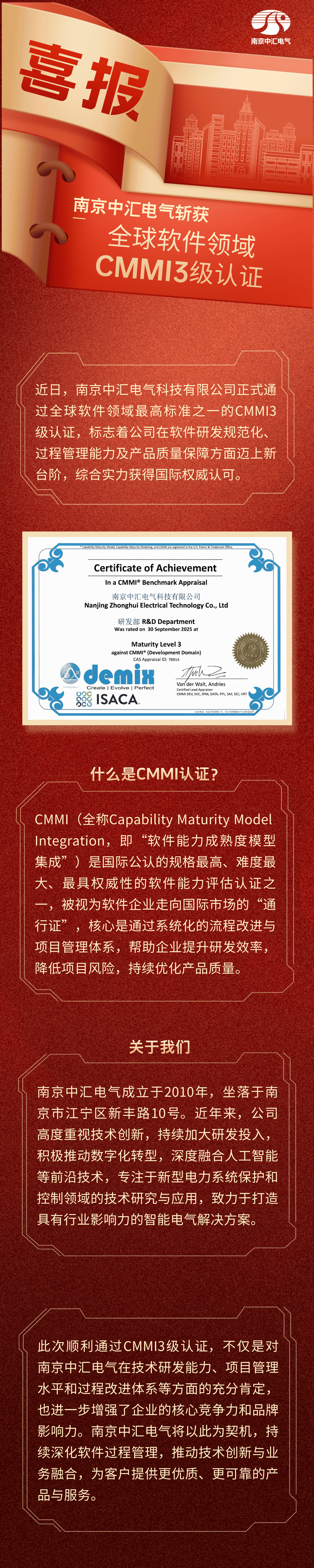喜报!南京中汇电气斩获全球权威CMMI3级认证